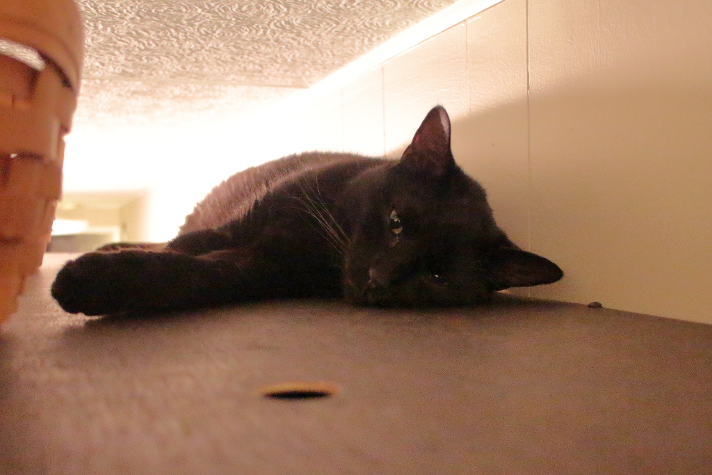 I assumed he wasn’t feeling well and I felt bad but I pulled him out from under the bed and set him on top of the utility cart in the kitchen. It was one of Puck’s favorite places to hang out, which is why we always kept a rug on top of it. But he didn’t want to be there. Instead, he jumped on my shoulders so I could carry him to the top of the china cabinet. He liked it there because nobody could bother him.