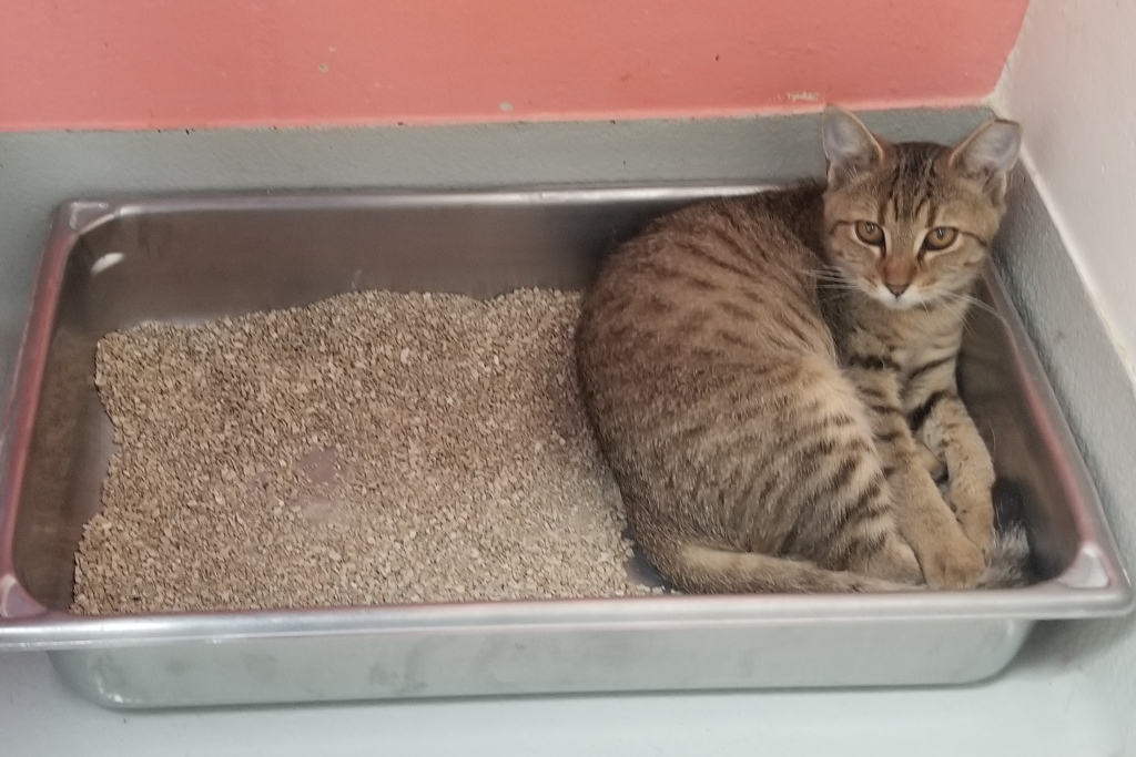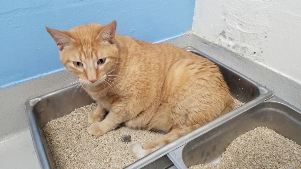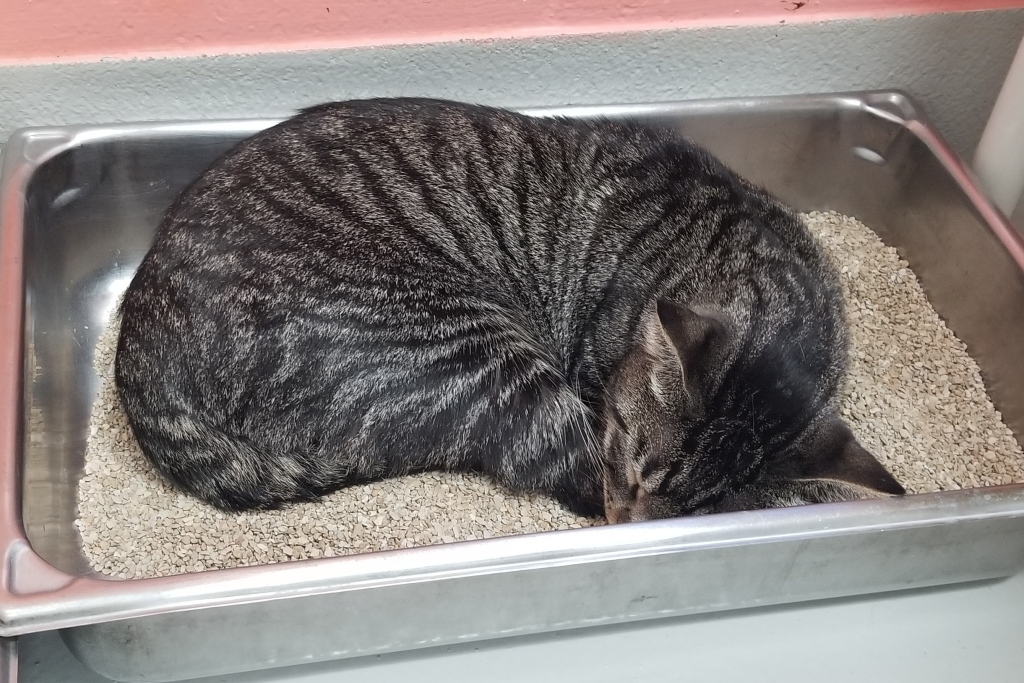Since starting as a volunteer at the SPCA a few months ago, I have noticed a surprisingly high number of cats who spend there time lying in litter boxes. I don’t know why. The pods at the SPCA are about 100 square feet with plenty of vertical sleeping areas. Perhaps it is a reaction to stress. Considering there are between four and eight cats in each pod and the pods are constantly changing as cats come and go, I can understand why it would be stressful, especially for the more timid cats.