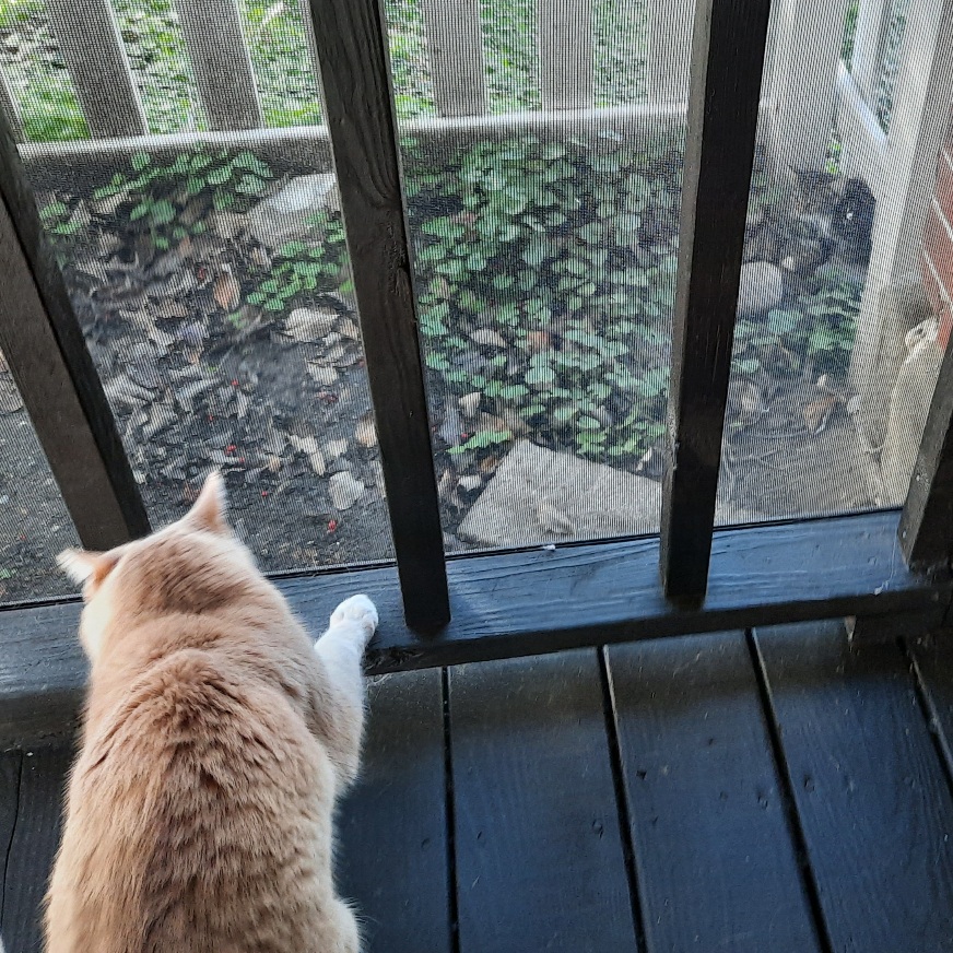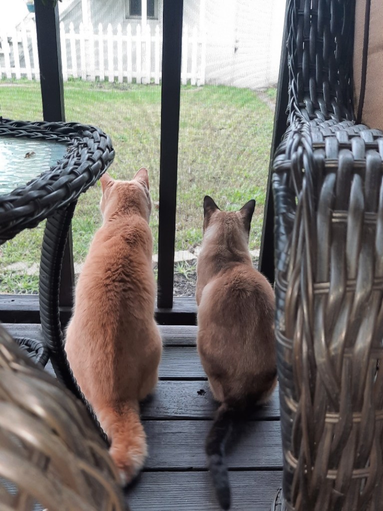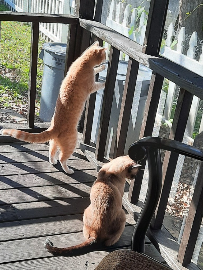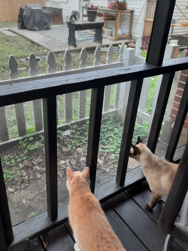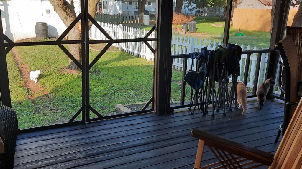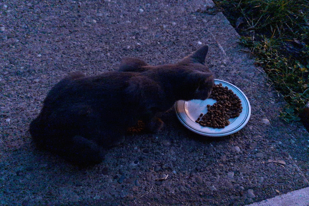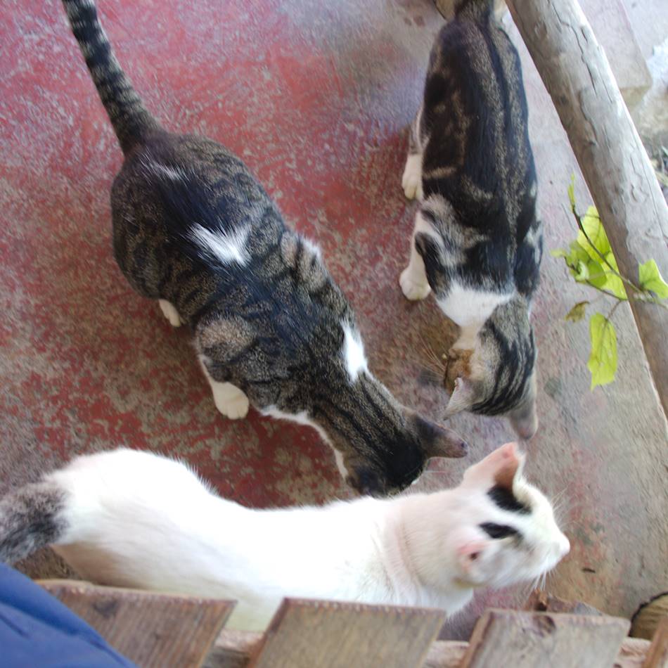 I gave them some of my sausage and they happily ate it. Soon a third cat showed up.