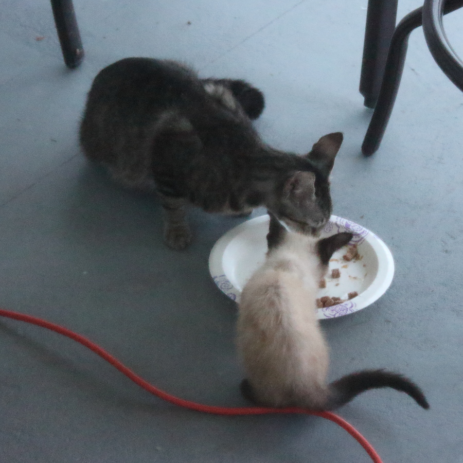 After my last post about the feral cat and kittens that have been coming to our house, I didn’t see them for about a week. I kept food out for them and some days it would be gone when I checked on it and some days it would still be there. We were never sure if the cats were eating it or some other animal was coming around until Wednesday evening when the mother cat and her two Siamese looking kittens showed up.