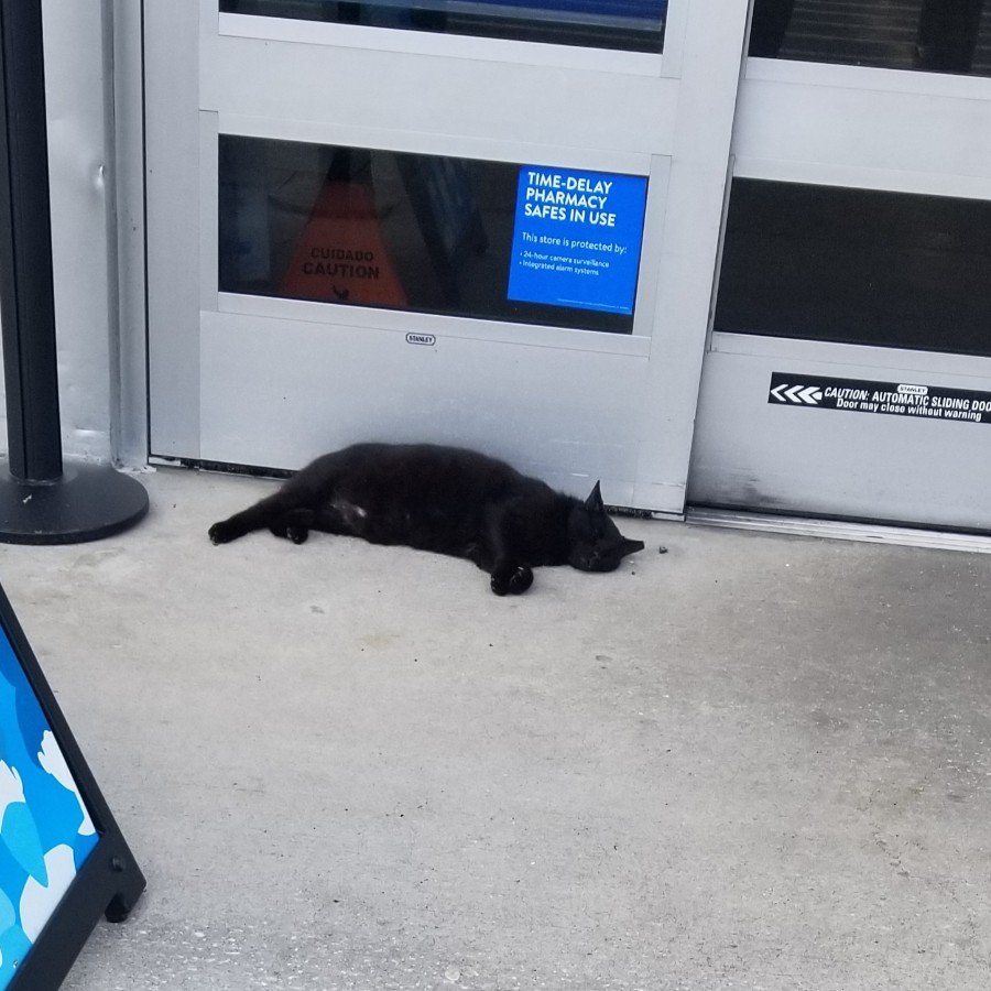 I was at that same Walmart again Wednesday morning and saw the same black cat napping at the door. My first thought was that Walmart hired a security cat that was sleeping on the job. I stopped and pet the cat for a minute before going inside.