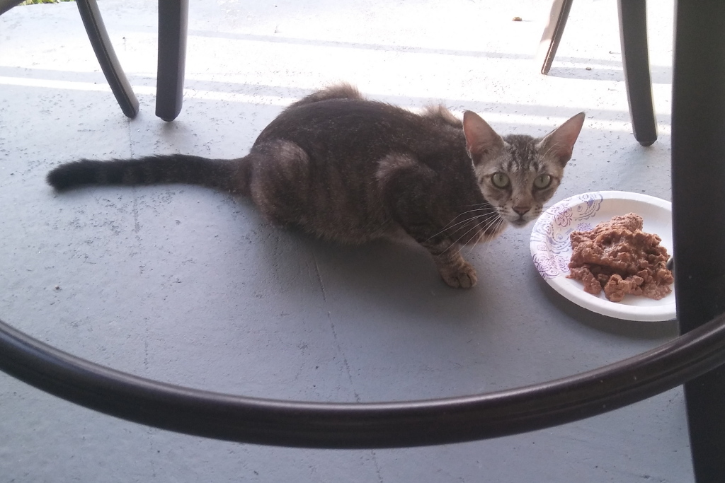 The last time I mentioned anything about the stray mom cat and her two kittens that have been coming to my house was June 18 (see here). After that, we didn’t see them much. Over the next week or so we saw the mom twice, three times at most. Each time she as without her kittens. That caused us to worry about what might have happened to them.