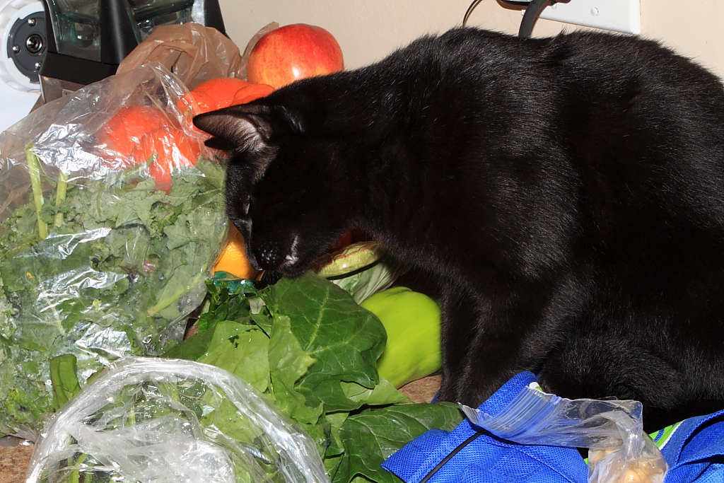 Last week I showed you what I go through when I try to make our lunches in the morning (see here). I mentioned that puck takes lettuce out of my salad. This time I caught him stealing spinach straight from the package.