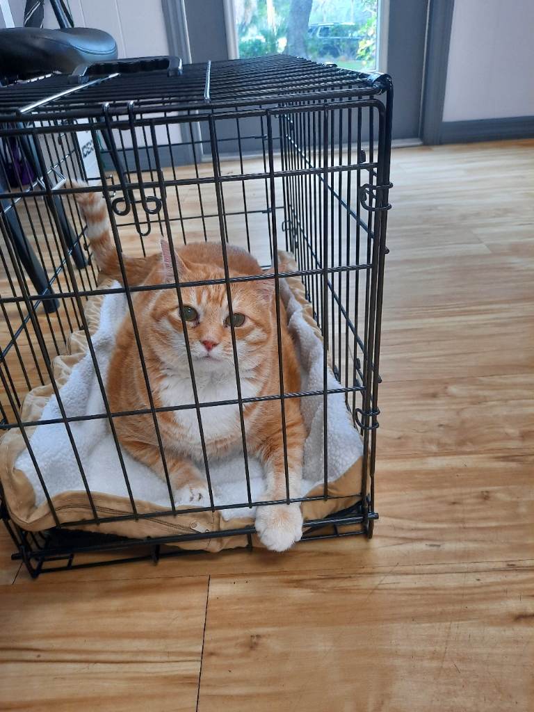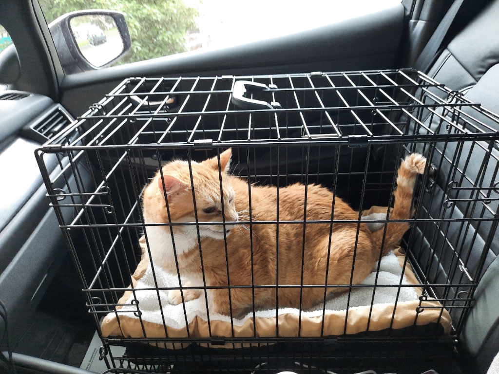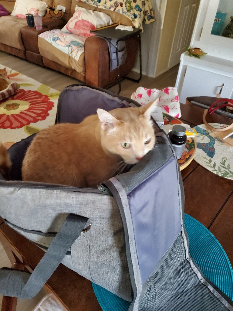 So, amazingly, we were able to get him in his carrier and I brought him to the vet. I didn’t get any useful photos but here is one from another trip to the vet.