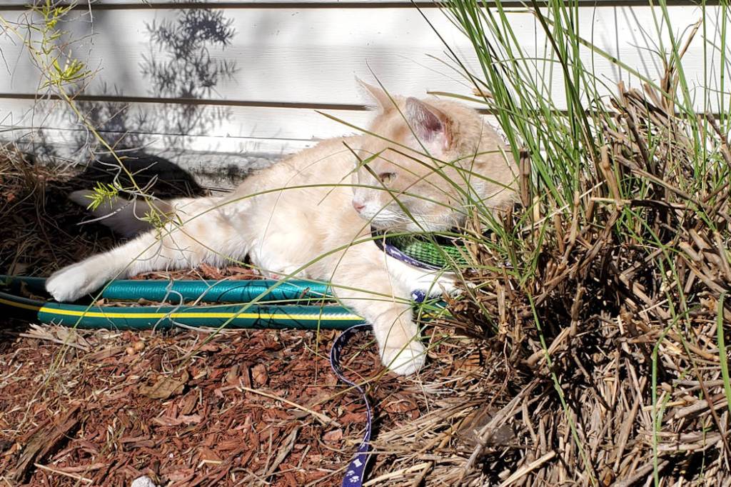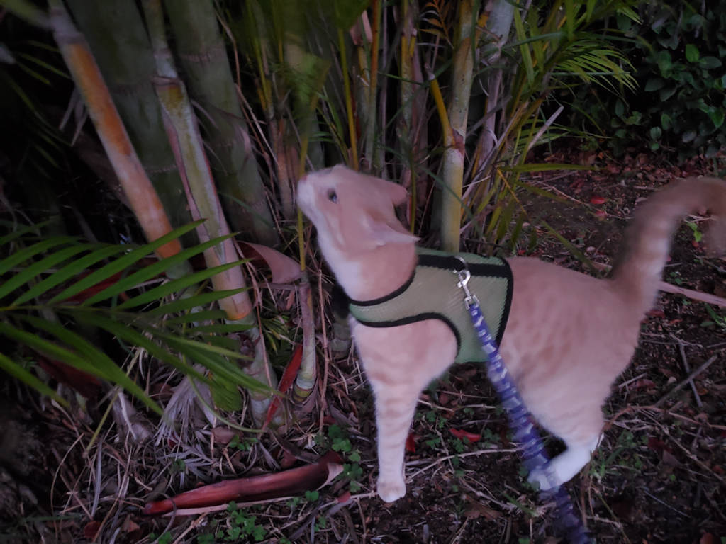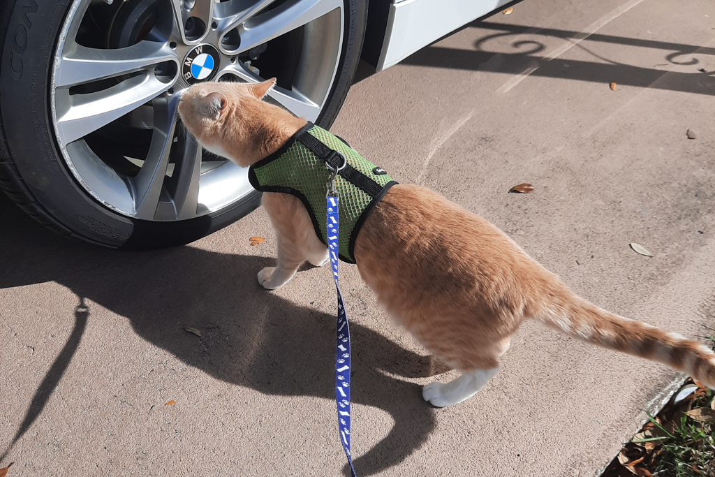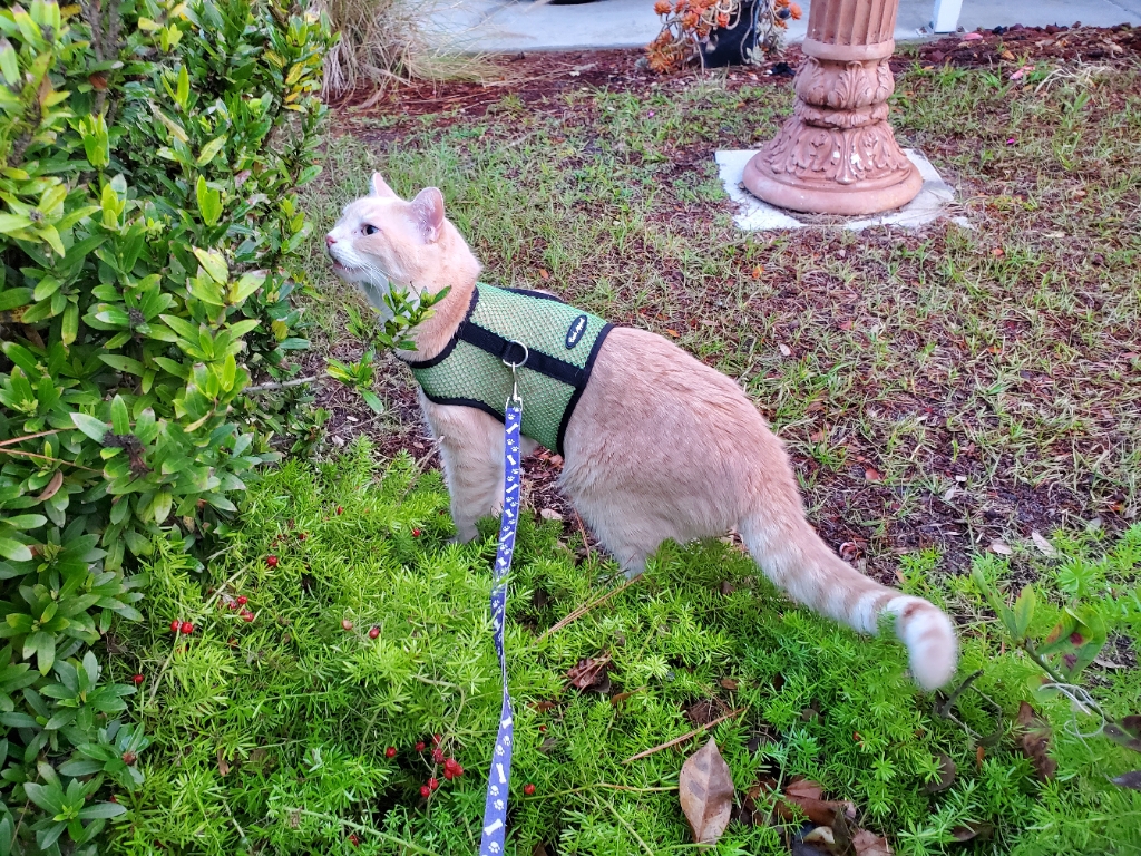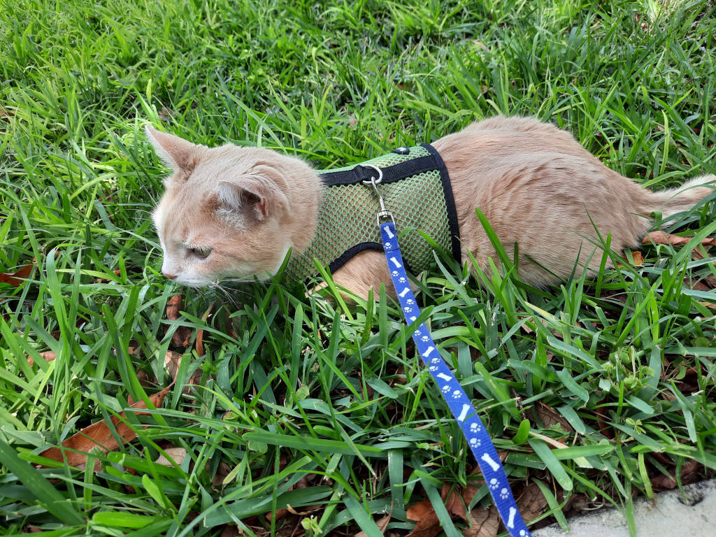 I should have tried to grab him then but I worried if I missed I would never catch him. Instead, I had an idea. I went back into the house and grabbed his harness. When I got close, I pulled it apart. He knows that the sound of the velcro means he is going for a walk so he came out and let me put it on. Unfortunately, I was rushed and put it on upside down. In the process of trying to reverse it, I nearly freaked him out a little. Before he got too nervous I turned it around and soon we were walking.