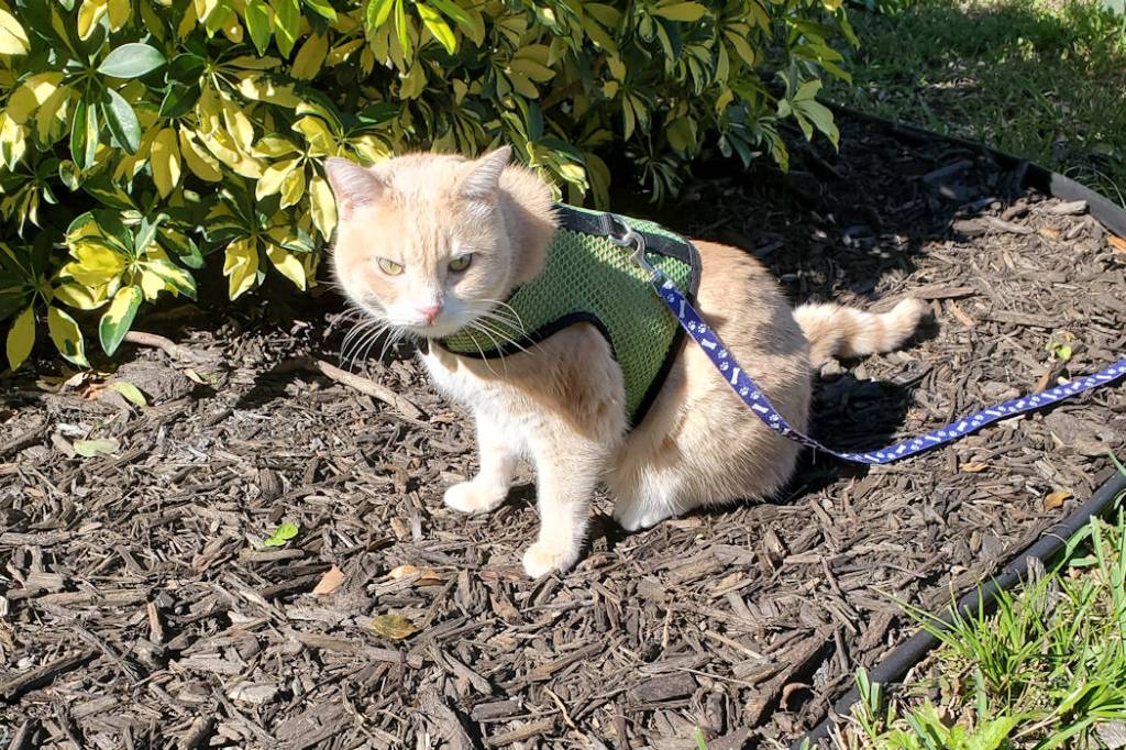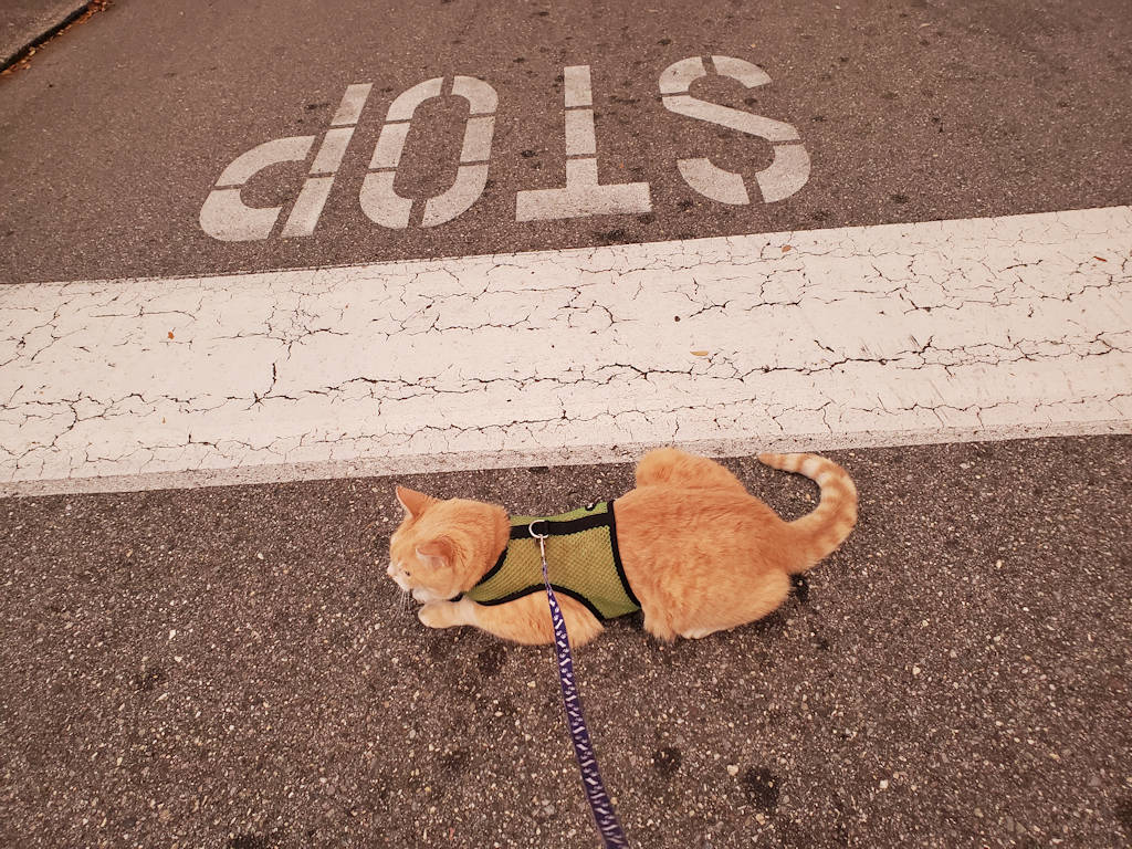 “Walk” is probably the wrong word to use when taking a cat out because they spend much more time investigating smells or just resting while enjoying the great outdoors.