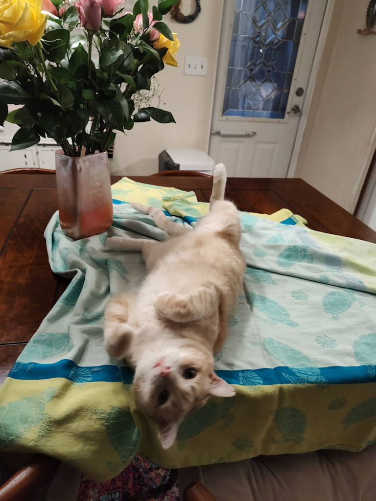 Good morning, everyone. I hope your day is going as good as Frankie’s. He started out this morning rolling around on the dining room table. Actually, he started by knocking my coffee off the table, but the point is, he was a happy kitty.